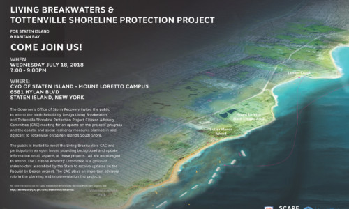 The Governor’s Office of Storm Recovery invites the public to attend the ninth Rebuild by Design Living Breakwaters and Tottenville Shoreline Protection Project Citizens Advisory Committee (CAC) meeting for an update on the projects’ progress and the coastal and social resiliency measures planned in and adjacent to Tottenville on Staten Island’s South Shore.