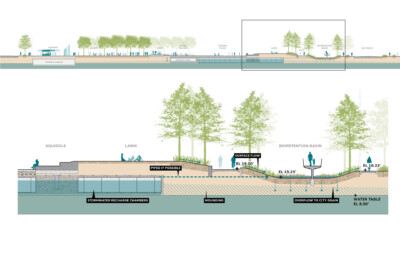 SCAPE’s work throughout the ERC also includes open space surrounding multiple buildings and on-structure landscapes; multi-modal streetscapes incorporating stormwater management infrastructure; and a Laneway connecting Western Avenue to the greenway. The collective public realm at the ERC will ultimately be a community destination and anchor for nearby residents and stakeholders as well as faculty, staff, students, and visitors alike—a vibrant, walkable, and flexible commons.