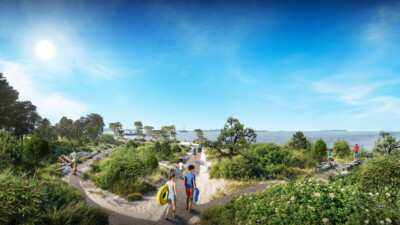 The design for the site preserves as much as possible of this accidental ecosystem and transforms this once fenced site into a park like no other—a healthy public space with water access, public swimming, play space, recreational and ecological experiences, and a network of walking paths. SCAPE’s plan incorporates remediation strategies that will revive Manresa’s coastal ecosystems and preserve the feeling and character of many of its post-industrial landscapes. To ensure the site is resilient, the design expands living shorelines, adds tree canopy to combat extreme heat, and elevates portions of the site around the power plant to mitigate increased flooding and sea level rise.